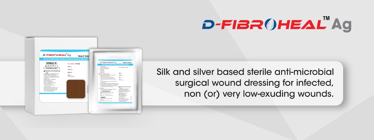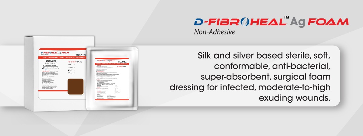 Intended Use: D-Fibroheal Ag Foam is intended for use in management of wide range of mild to highly exuding, infected chronic wounds with delayed healing such as diabetic foot ulcers, pressure ulcers and pressure sores. The dressing can also be used for management of 2nd degree burns, donor sites, skin abrasions, partial and full thickness wounds, trauma or surgical wounds, mechanically or surgically debrided wounds, orthopaedic and vascular wounds etc.