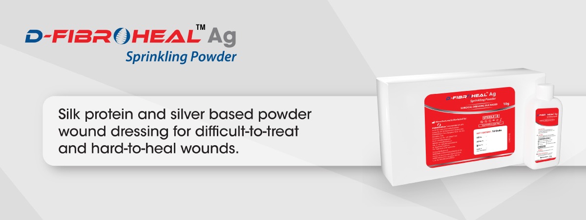 Description: D-Fibroheal Ag Sprinkling Powder is first of its kind revolutionary product, in terms of its unique components, properties and performance. It is specially formulated to offer bioburden reduction, fluid management and faster healing to virtually any size, shape or depth of the wound, best suited for both difficult-to-dress and difficult-to-heal wounds.