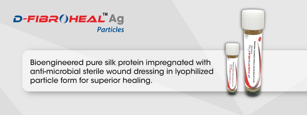 Description: D-Fibroheal Ag Particles are pure lyophilized silk protein & nano silver based antimicrobial particles with an increased surface area in a completely bio-absorbable form for advanced and faster healing.